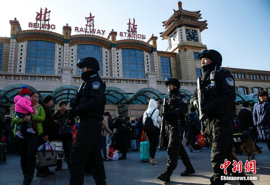 1月24日,北京铁路警方在北京站持枪巡逻。当日,2016年春运大幕正式拉开,并将持续40天,至3月3日结束。
