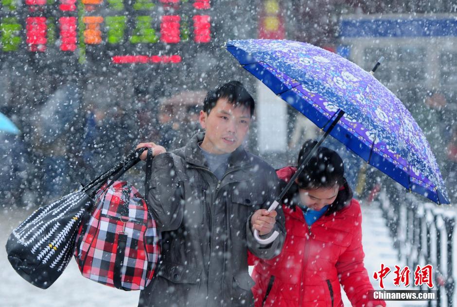 1月31日,在江西九江火车站出站口,南昌铁路局九江车务段的职工顶着大雪正在清扫积雪,确保旅客安全出行。当天,江西多地出现中到大雪。目前,正值春运,南昌铁路局紧急启动应急预案,组织人力加强线路巡查,及时清扫火车站进、出站和线路、道岔上的积雪,密切关注天气变化,加大设备检修力度,及时消除冰雪天气对行车设备的影响,全力确保春运期间运输安全,方便旅客安全出行。图为在江西九江火车站出站口,旅客冒着大雪出站。 胡国林 摄