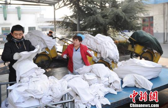 图为列车上取下来的被件被送到洗涤车间等待处理。 杨艳敏 摄