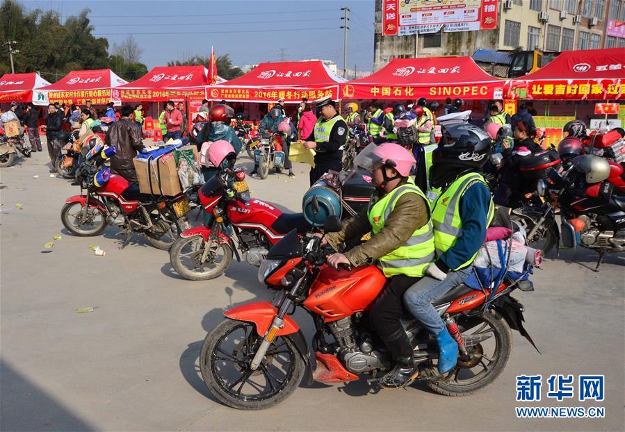 1月30日,大批自驾摩托返乡的务工人员进入广西贺州市羊角山春运服务站休息。临近春节,大批在珠三角地区工作的务工人员骑行摩托车踏上回广西、湖南、云南、贵州等地家乡的归途。 新华社发(廖祖平 摄)