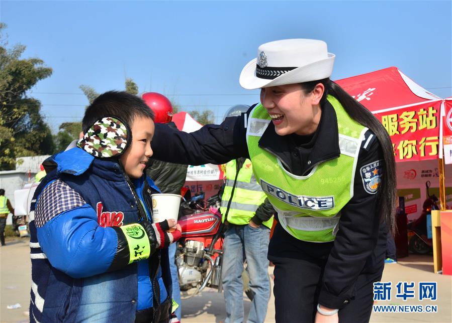 1月30日,在广西贺州市羊角山春运服务站,一名女交警给随父母骑乘摩托车返乡过年的8岁男孩陶振宇戴上御寒护耳。临近春节,大批在珠三角地区工作的务工人员骑行摩托车踏上回广西、湖南、云南、贵州等地家乡的归途。 新华社发(廖祖平 摄)