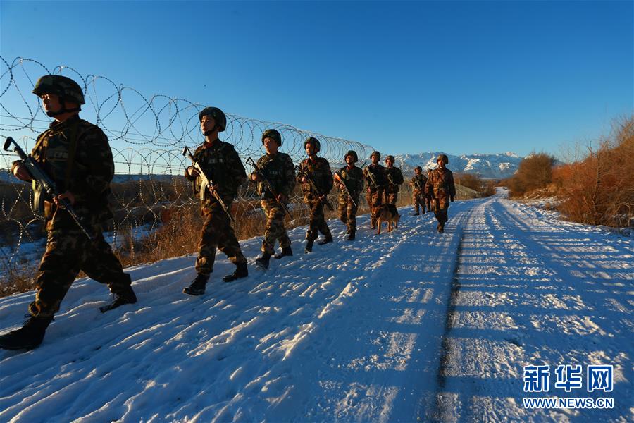 解放军边防连队战士和武警边防官兵在霍城边境地区联合巡逻踏查(1月30日摄)。 1月30日,武警新疆伊犁边防支队联合解放军边防部队,在伊犁霍城县边境地区开展联合执法巡边行动,并进行多项联合演练。在联合行动中,官兵们使用北斗卫星系统、无线电台、通信指挥车等信息化装备,探索实践科学数字化管控新模式,确保春节前夕边境地区的安全稳定。新华社发(贾航超 摄)