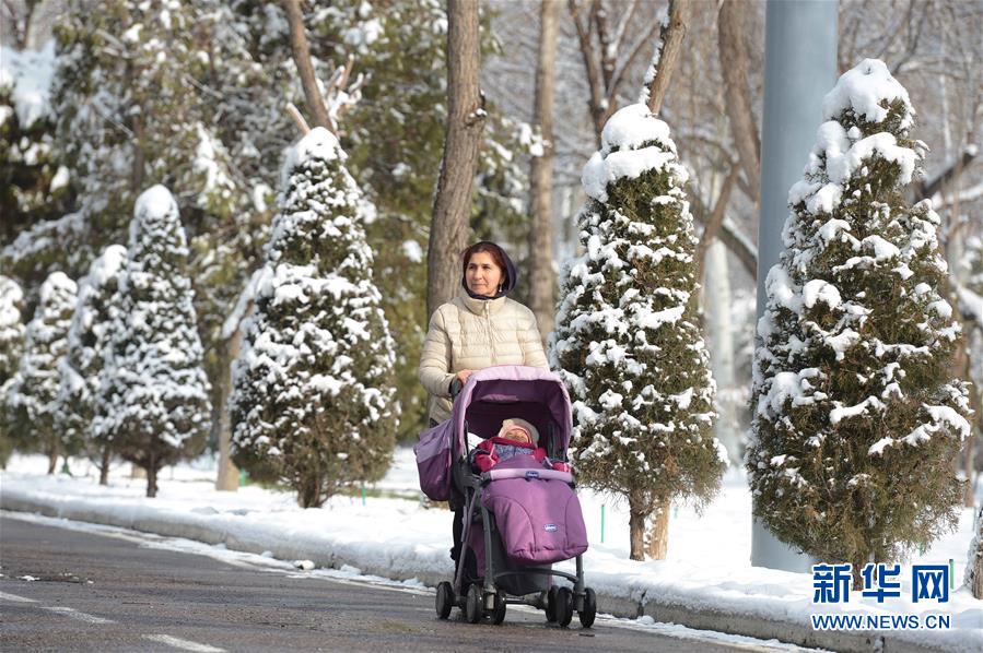 1月30日,在乌兹别克斯坦首都塔什干市区,一名市民推着孩子走在路上。乌兹别克斯坦首都塔什干经过连续几天的雨夹雪天气后,30日迎来雪后初晴。 新华社记者沙达提摄