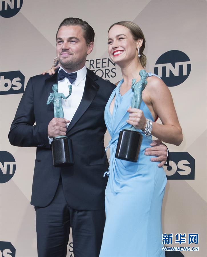 1月30日,在美国洛杉矶,演员莱昂纳多·迪卡普里奥(左)和布丽·拉森获奖后合影。莱昂纳多·迪卡普里奥凭借影片《还魂者》获最佳男主角奖,布丽·拉森凭借影片《房间》获最佳女主角奖。当日,第22届美国演员公会奖颁奖典礼在洛杉矶圣殿礼堂举行。 新华社记者杨磊摄