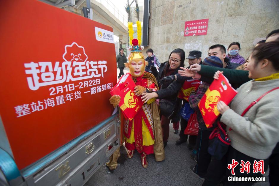 猴年新春佳节日益临近,中国各地以“猴”元素为主题的活动,也逐渐增多。2月3日,山西太原,某电商的快递员纷纷化身为“美猴王齐天大圣”为民众们送起了快递。张云 摄