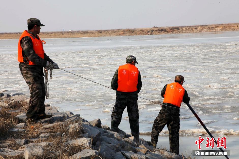 2月3日,垦利黄河河务局冰凌观测队队员探查冰凌情况。受持续低温影响,黄河下游山东段河道全线出现淌凌,封河长度达206.95千米,河道内46座浮桥被拆除。中新社记者 刘亮亮 摄