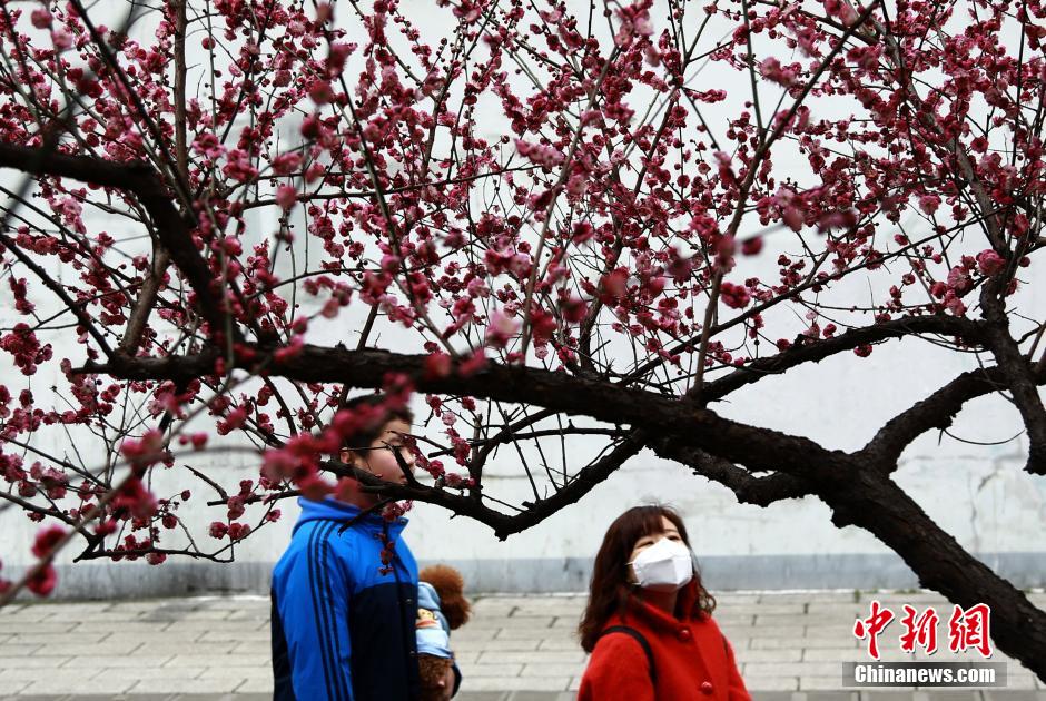 2月13日,被称为武汉“梅花大道”中北路白鹭街上,路两侧种植的美人梅和朱砂梅怒放,渲染浓浓春意,引过往行人驻足观赏。