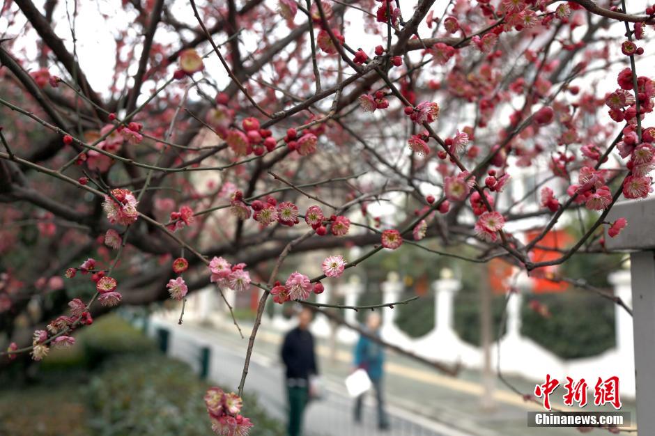 2月13日,被称为武汉“梅花大道”中北路白鹭街上,路两侧种植的美人梅和朱砂梅怒放,渲染浓浓春意,引过往行人驻足观赏。