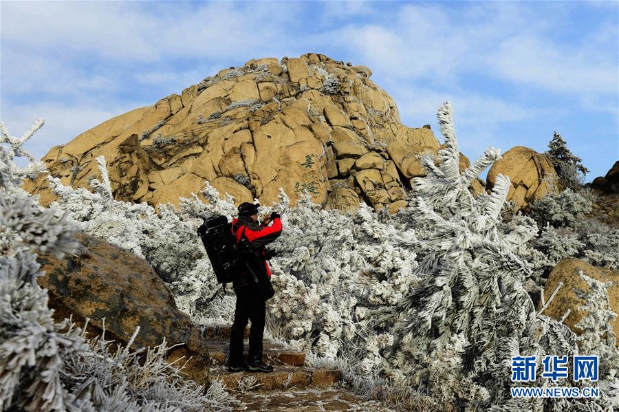 2月14日,在山东青岛灵珠山,一名游客在拍摄因降温而出现的雾凇。 2月11日至14日,受寒潮影响,我国中东部地区大风降温和雨雪天气持续。中央气象台14日18时继续发布寒潮黄色预警。 新华社发