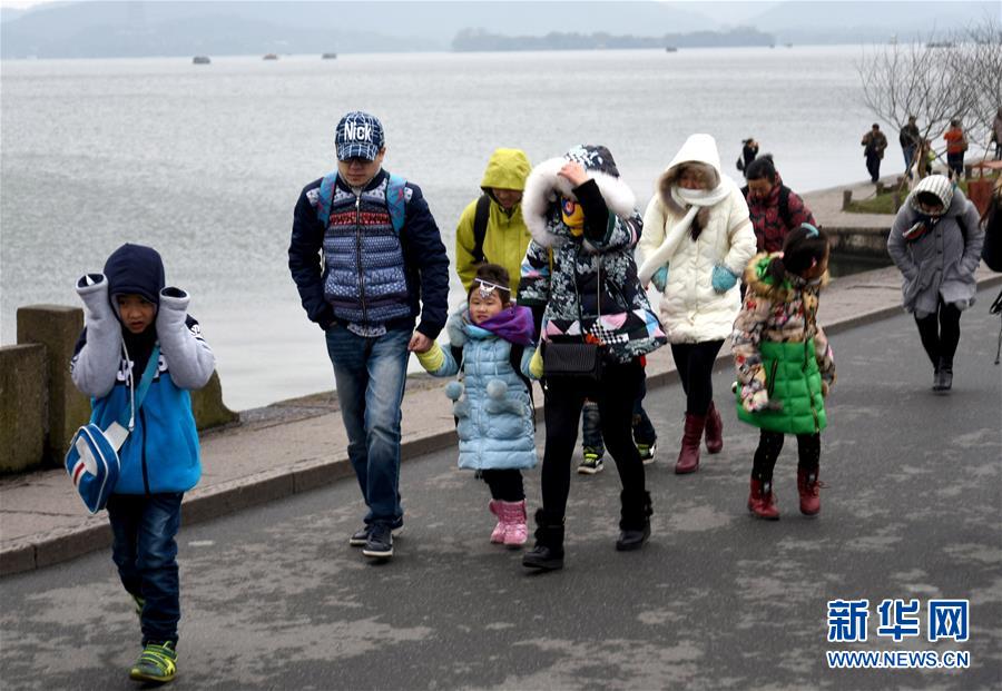 2月14日,游客身着御寒冬装游览杭州西湖。 2月11日至14日,受寒潮影响,我国中东部地区大风降温和雨雪天气持续。中央气象台14日18时继续发布寒潮黄色预警。 新华社发(施健学摄)