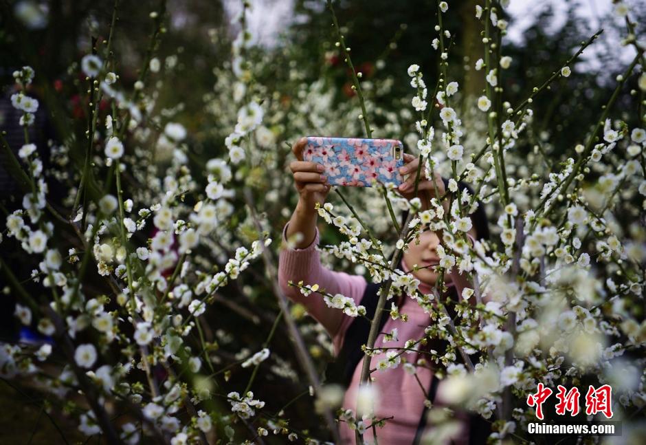 2月20日,三湘大地气温逐渐回升,湖南省森林植物园千株梅花竞相绽放,众多游客置身于花海中,与这难得的美景合影留念。 杨华峰 摄
