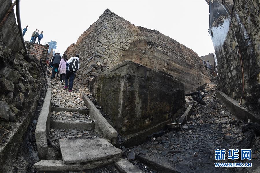 2月21日,温泉村村民从大火后的废墟中走过。 2月20日18时许,贵州省黔东南苗族侗族自治州剑河县岑松镇温泉村发生寨火。据初步统计,寨火造成120人受灾,60余栋房屋被烧毁。目前,大火已全部扑灭,暂无人员伤亡报告,受灾群众的饮食和居住得到初步安置。火灾原因及具体受灾情况还在进一步调查核实中。新华社记者 欧东衢 摄