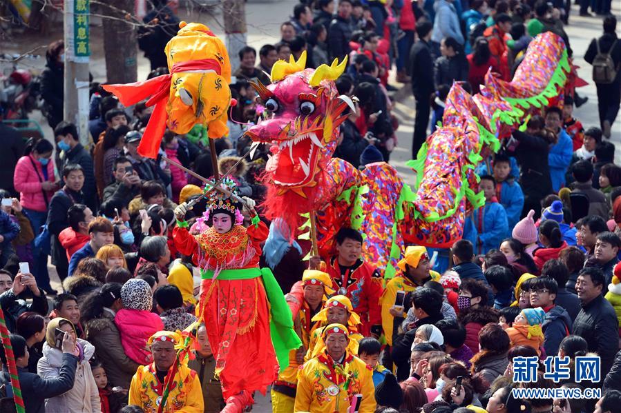 2月21日,社火队在进行巡游拜年。当日,有着千年历史的传统村落——山东省章丘市三德范村组织31个社火队举行社火巡游拜年活动,在元宵佳节来临之际为乡亲们送祝福。新华社记者 郭绪雷摄