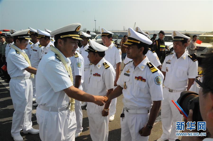 2月22日,在柬埔寨西哈努克港,中国海军第二十一批护航编队指挥员俞满江少将(左)与前来迎接的柬埔寨海军代表握手致意。中国海军第二十一批护航编队的柳州舰、三亚舰22日抵达柬埔寨西哈努克港,开始对柬埔寨进行为期5天的友好访问。此次访问,是中国海军舰船第三次访问柬埔寨,也是海军战斗舰艇首次访问柬埔寨。新华社记者张艳芳摄