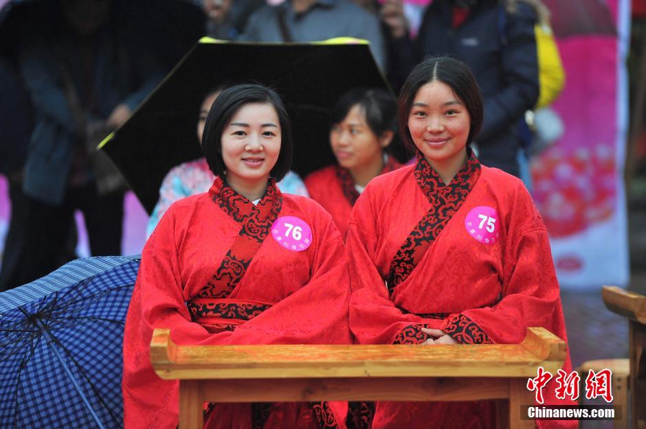 身穿红色汉服的女子在参加相亲会。 中新社记者 胡雁 摄