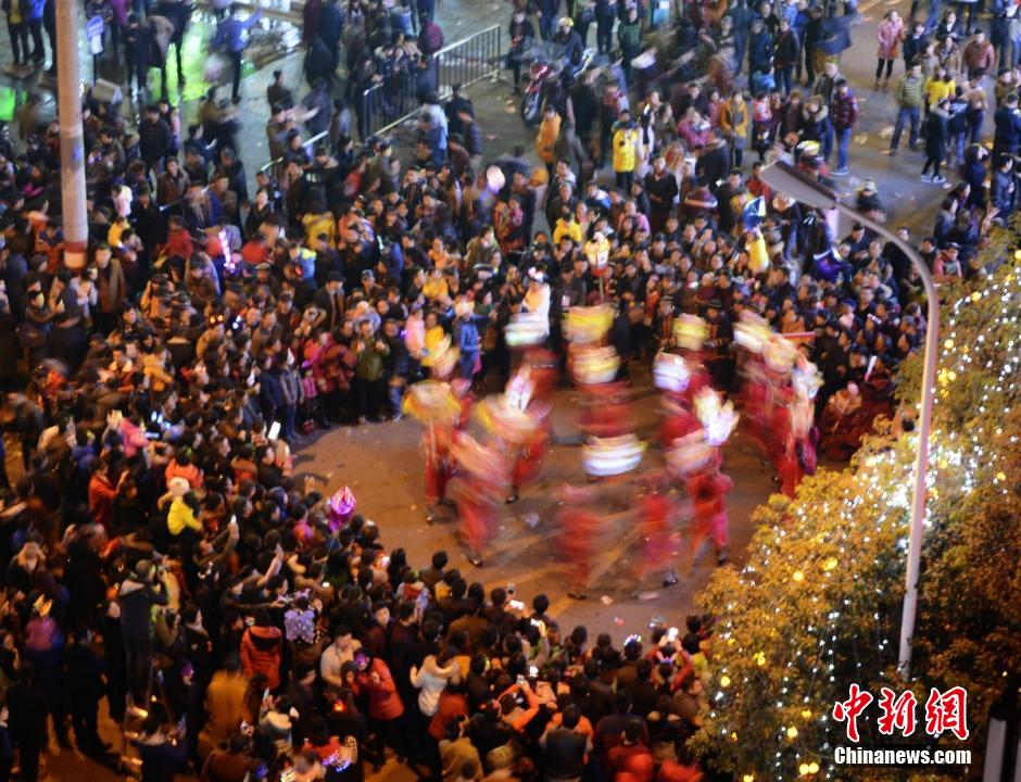 2月22日晚,众多市民与游客涌入湖南张家界市永定城区街头狂欢,共同庆祝元宵节的到来。图为街头的花灯表演吸引市民围观。杨华峰 摄