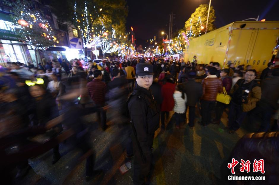 2月22日晚,众多市民与游客涌入湖南张家界市永定城区街头狂欢,共同庆祝元宵节的到来。官方安排武警在街头站成了人墙分流,确保市民人身安全。杨华峰 摄