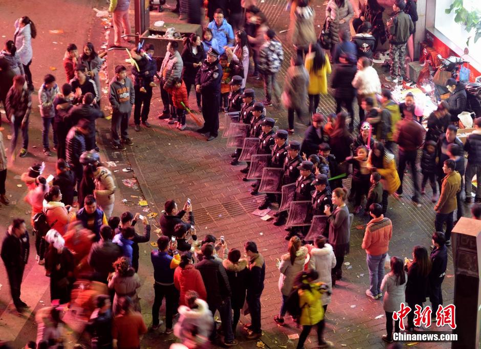2月22日晚,众多市民与游客涌入湖南张家界市永定城区街头狂欢,共同庆祝元宵节的到来。官方安排武警在街头站成了人墙分流,确保市民人身安全。杨华峰 摄