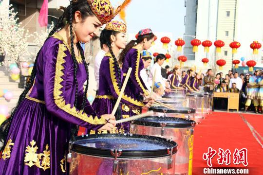 2月22日,托克逊县群众表演水鼓舞《幸福来敲门》。 李靖海 摄
