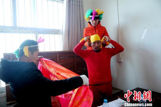 山西省运城市临猗县南赵村村民严继民在儿子的帮助下换衣服。扮演马角神的村民要穿一套红衣,头戴黄巾,头巾外面戴上特制的红、黄、绿三色马角帽。 陈卫 摄