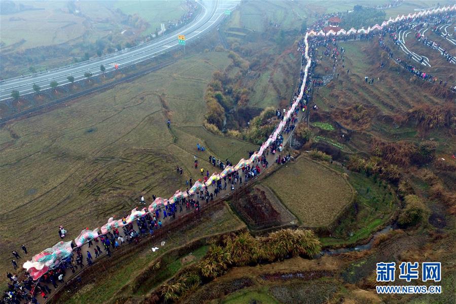 2月22日,巨龙巡游队伍行进在姑田镇的田间。当日,福建省龙岩市连城县姑田镇的客家乡亲簇拥一条长达500米的巨龙巡游田间地头,欢度元宵节。据了解,姑田镇的游龙活动起源于明朝万历年间,每年元宵节当地村民在家门前点松明、放鞭炮,迎接巨龙。新华社记者 彭张青 摄
