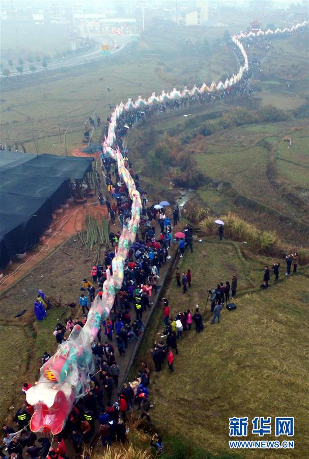 2月22日,巨龙巡游队伍行进在姑田镇的田间。当日,福建省龙岩市连城县姑田镇的客家乡亲簇拥一条长达500米的巨龙巡游田间地头,庆贺元宵节。据了解,姑田镇的游龙活动起源于明朝万历年间,每年元宵节当地村民在家门前点松明、放鞭炮,迎接巨龙。新华社记者 彭张青 摄