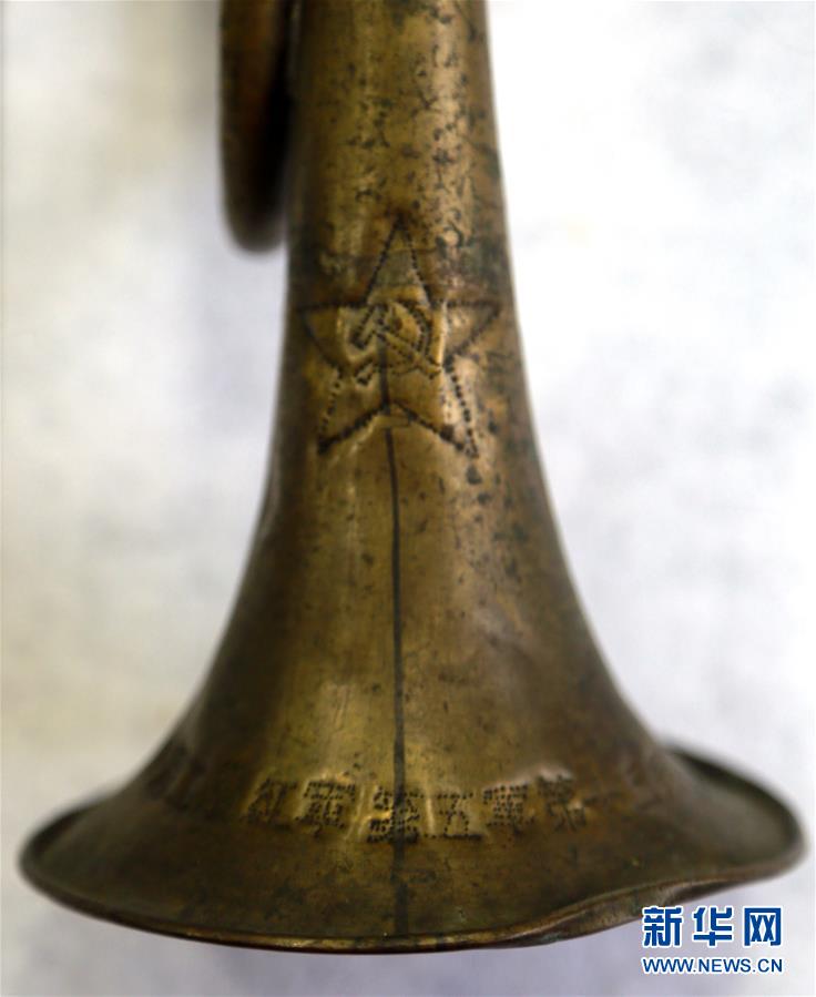 2月22日,福建省中央苏区博物馆工作人员首次展示收藏的中国工农红军第五军军号。这只军号纯铜材质,喇叭口外沿刻有“中国工农红军第五军第十三师”字样,号身中部刻有五角星等图案。 新华社记者 彭张青 摄