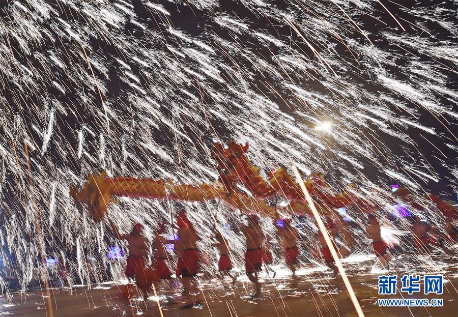 2月22日,重庆市铜梁县奇彩梦园景区内,表演者在绚烂的火花中舞动“火龙”。当日是元宵佳节,重庆铜梁举行传统的“火龙”表演。炽热的铁水火花、狂野的龙舞、赤膊上阵的舞龙人,在为节日助兴的同时,也为民众祈福纳祥,祈求新年风调雨顺。重庆铜梁“火龙”已有600多年历史。新华社记者 陈诚 摄