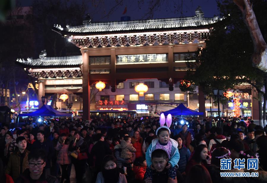 2月22日晚,游人进入夫子庙景区观灯游玩。当晚,在江苏南京夫子庙秦淮风光带举办的秦淮灯会彩灯齐放,人们前来观灯闹元宵。 新华社记者孙参摄