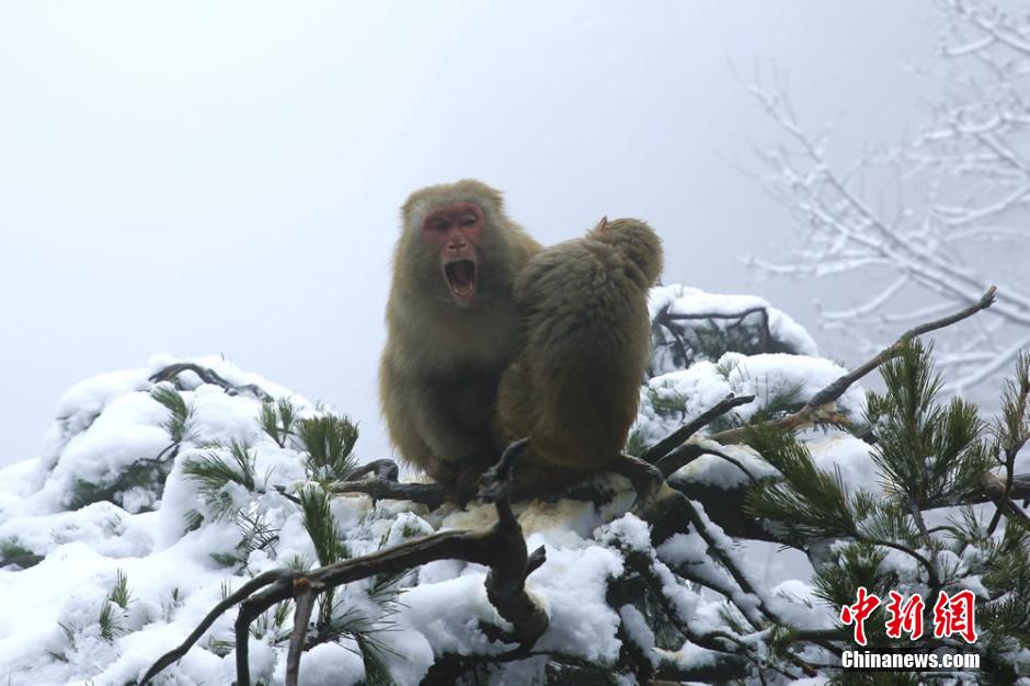 2月22日正值元宵佳节,湖南张家界核心景区武陵源喜降春雪。在黄石寨景区,成群的野生猕猴或在雪中追逐戏闹,或在树枝上攀爬跳跃,或蜷缩着身子卖萌,成为张家界武陵源的一道春季新景。吴勇兵 摄