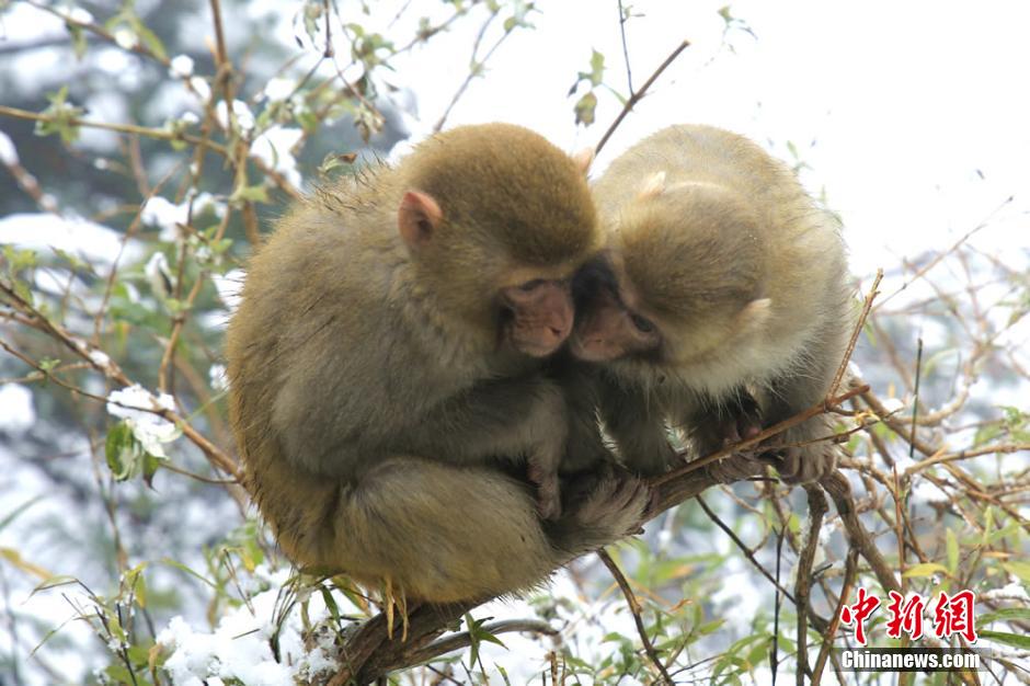 2月22日正值元宵佳节,湖南张家界核心景区武陵源喜降春雪。在黄石寨景区,成群的野生猕猴或在雪中追逐戏闹,或在树枝上攀爬跳跃,或蜷缩着身子卖萌,成为张家界武陵源的一道春季新景。吴勇兵 摄
