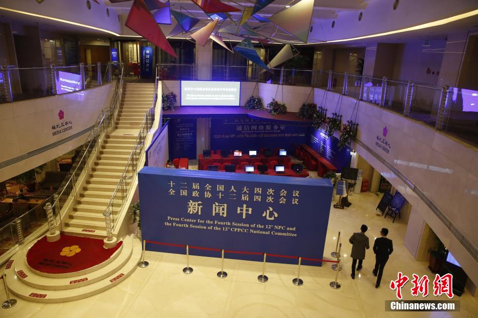 2月27日,2016年中国两会开幕在即,位于北京梅地亚中心酒店的两会新闻中心正式启用。 中新社记者 张浩 摄