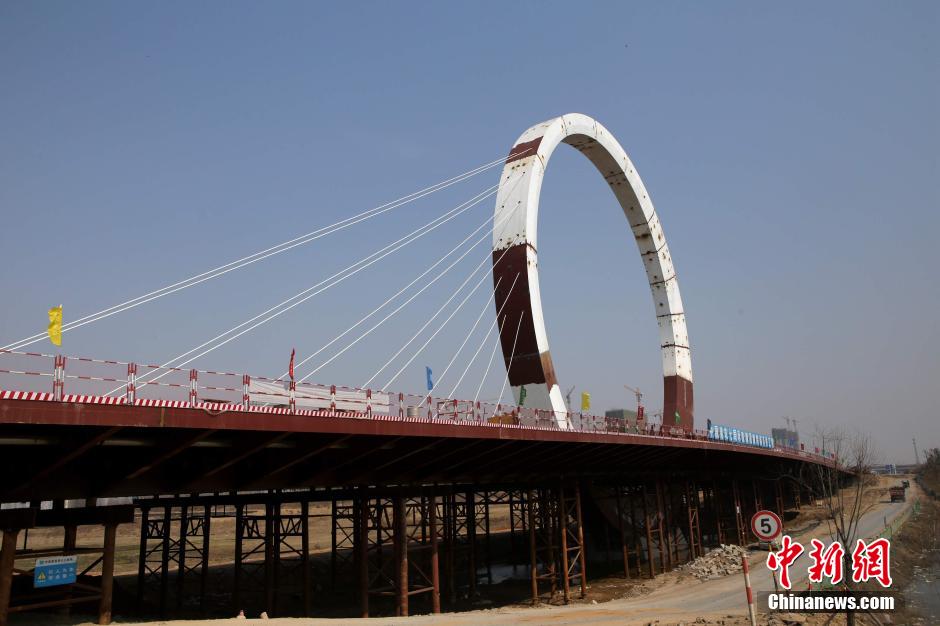 2月28日,河南郑州,位于郑州市滨河国际新城蝶湖环线上,一个巨大白色圆环竖立乡野间,显得很突兀。有的市民称像“摩天轮”,也有的称像神话传说中的魔戒。据了解,这个“摩天轮”原来是大桥钢索斜拉塔,桥名叫潮晟路蝶湖大桥,采用独塔斜拉桥,桥梁全长225米,桥梁全宽为32米。开工日期为2014年12月6日,将于近期竣工。 王中举 摄