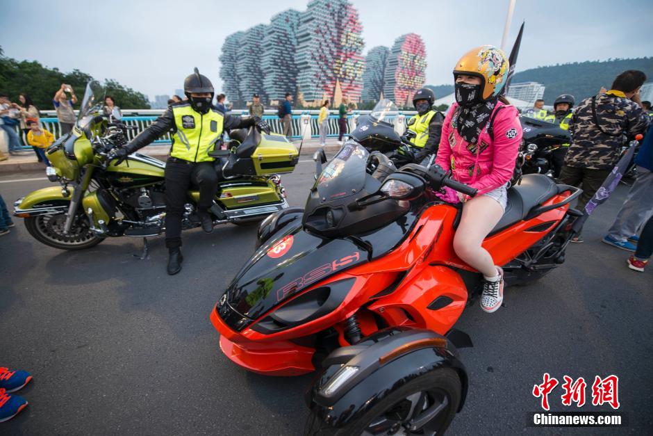 图为女摩托车手正在等在发车。 中新社记者 骆云飞 摄