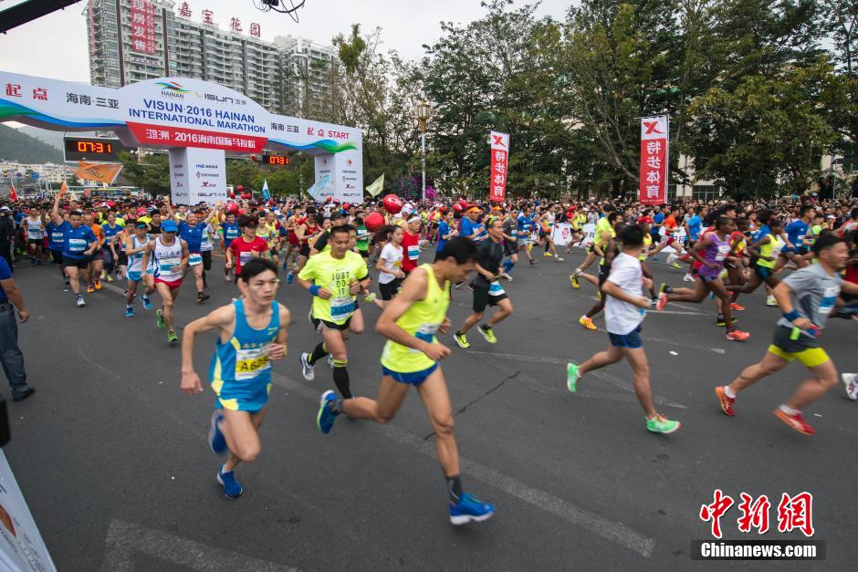 2月28日,2016海南国际马拉松赛在三亚鸣枪开跑。来自中国、阿根廷、澳大利亚、巴西、德国、加拿大、埃塞俄比亚、肯尼亚、日本等23个国家或地区的17500名选手报名参加。赛事分为全程马拉松、半程马拉松和迷你马拉松三个组别。全程马拉松组别中,男女前三名全部被来自非洲的选手包揽。 中新社记者 骆云飞 摄