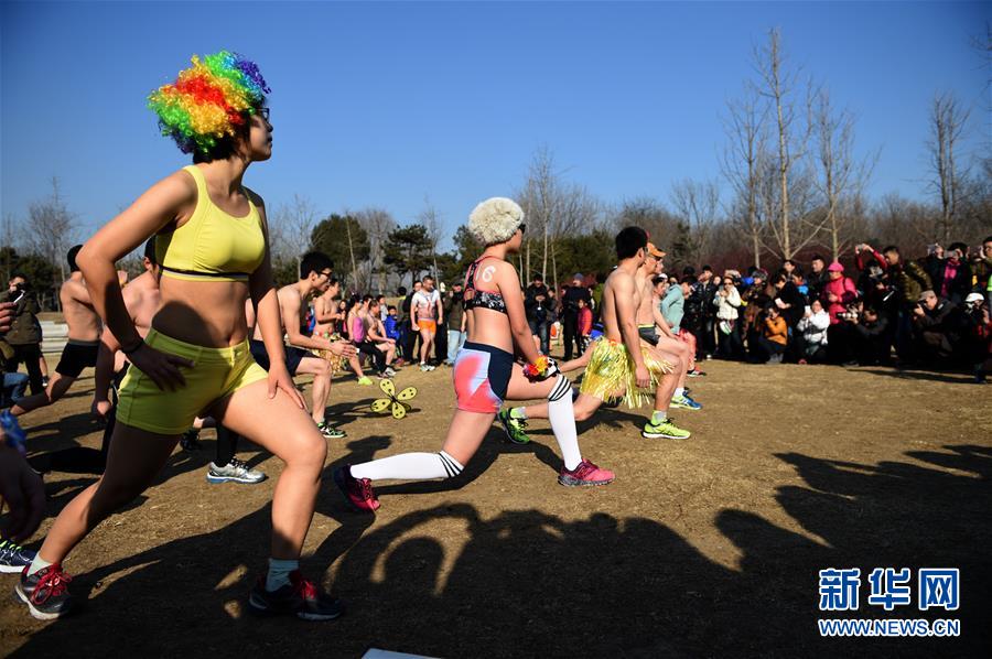 2月28日,跑步爱好者在活动前热身。当日,由百余名跑步爱好者自发组织的2016年北京“光猪跑”活动在奥林匹克森林公园举行,“光猪跑”活动的参加者只着泳衣或短裤等进行5公里的健身跑,以此倡导亲近自然、积极健身的生活方式。新华社记者鞠焕宗摄