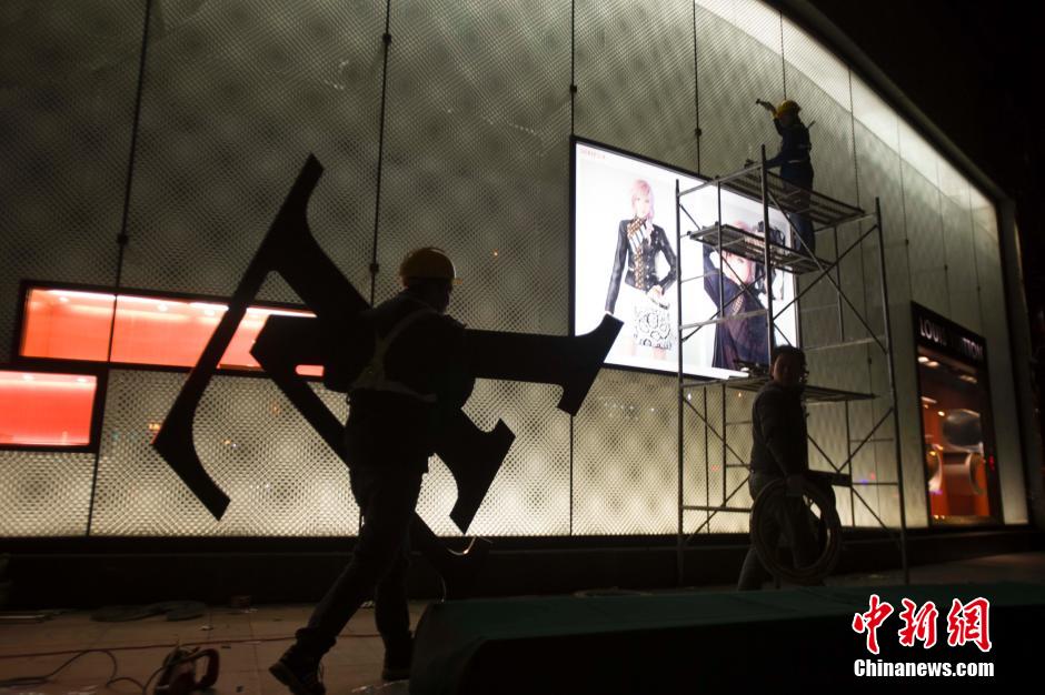 2月28日深夜,山西太原,工人正在拆除路易·威登(LV)店面外立面标识。当晚,法国奢侈品牌路易·威登(LV)在中国山西太原正式闭店。 张云 摄