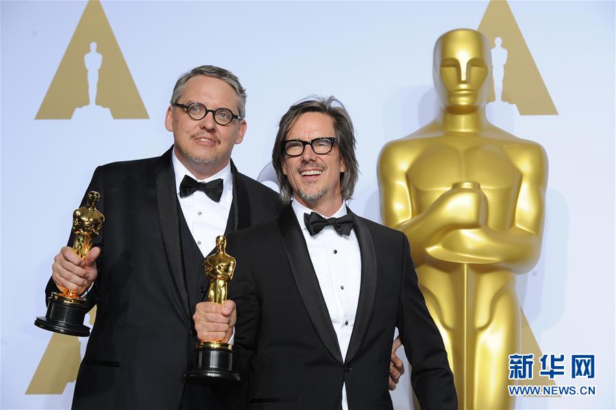 2月28日,在美国洛杉矶杜比剧院,亚当·迈凯(左)和查尔斯·兰道夫手捧奥斯卡奖杯。当日,亚当·迈凯和查尔斯·兰道夫凭借影片《大空头》荣获第88届奥斯卡最佳改编剧本奖。 新华社记者杨磊摄