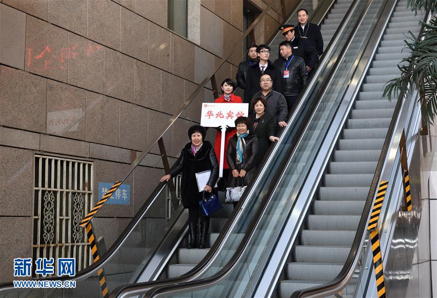 3月1日,来自内蒙古自治区的全国政协委员抵达北京,出席全国政协十二届四次会议。这是委员乘火车抵达北京西站后,在工作人员的引领下准备前往驻地。新华社记者 张领 摄