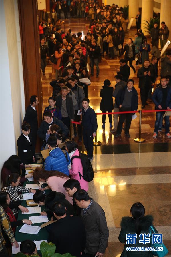 3月1日,记者们在全国政协礼堂排队领取证件。当日下午,全国政协十二届四次会议内地记者情况通报会在全国政协礼堂召开。会后,参加全国政协十二届四次会议采访报道的记者领取证件。新华社记者金立旺摄