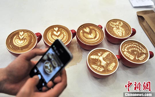 图为选手现场表演咖啡拉花吸引民众拍照。 中新社记者 任东 摄