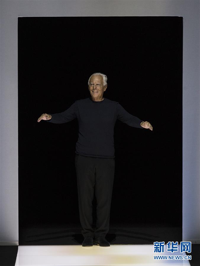 2月29日,在意大利米兰时装周上,设计师乔治·阿玛尼在发布会结束后向观众致意。黑色、细密、极具质感却神秘莫测——当日,乔治·阿玛尼(Giorgio Armani)在米兰时装周打造了一个“黑色天鹅绒”的梦幻世界。本季的服饰以柔和光亮的天鹅绒为主要面料,并饰以提花、斑点、渐变或写意的花朵图案。新华社记者金宇摄