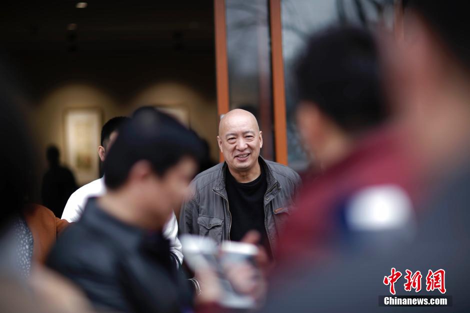 3月12日,恰逢植树节,《老树画画》水墨作品展在北京琉璃厂饮兰山房正式开幕。老树,本名刘树勇,现为中央财经大学教授、艺术系主任。此次老树携百余幅作品亮相饮兰山房,是老树作品第一次在北京如此大规模的展示。图为老树与粉丝交流。