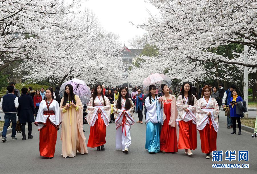 3月17日,在南京林业大学樱花大道,几名身着传统服饰的女生一边行走一边赏花。