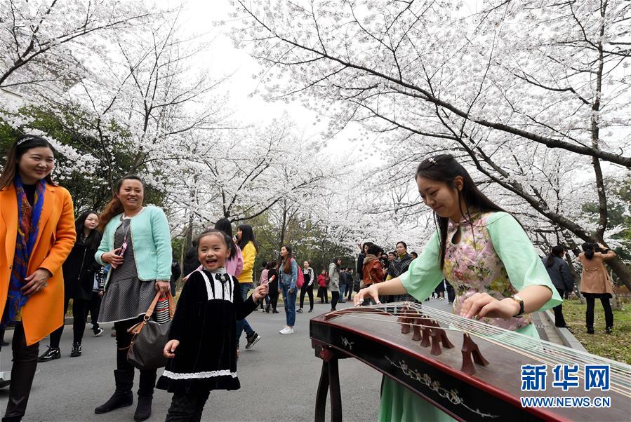 3月17日,在南京林业大学樱花大道,一名学生在演奏古筝。