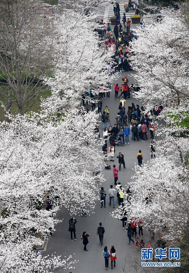 3月17日,市民和学生在南京林业大学樱花大道赏樱。