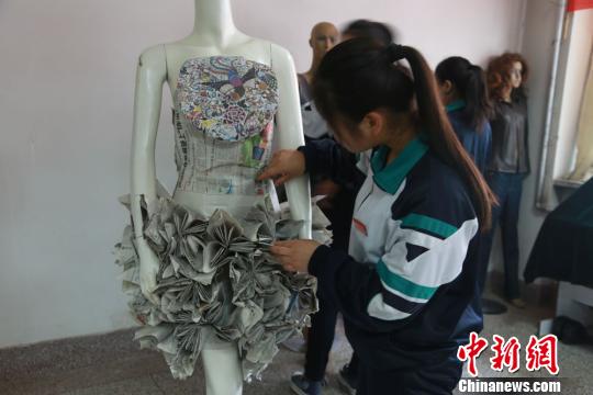 兰州理工中等专业学校学生展示自己制作的华美礼服,他们利用废旧报纸、塑料和布料等,大胆创新,精巧制作,做出一件件精美的礼服,既锻炼动手能力,也启发同学们的创意思维。