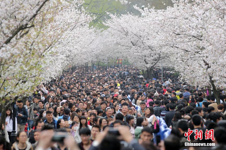 3月20日,大批市民和游客涌进南京鸡鸣古刹门前的樱花大道上,欣赏盛开的樱花盛开,感受春日气息。 中新社记者 泱波 摄