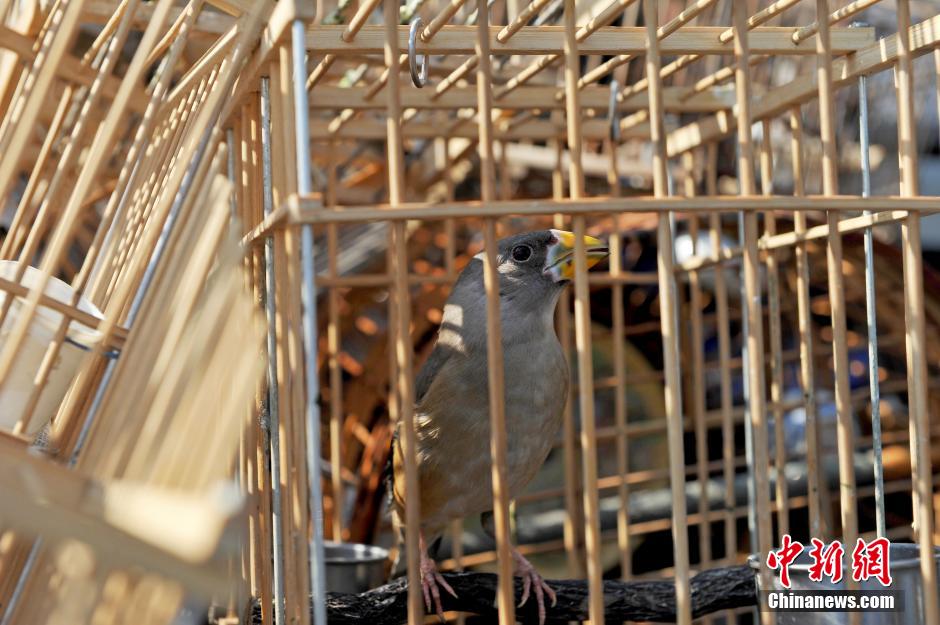 一只被解救的野生鸟类缩在笼子里。 中新社记者 孙昊声 摄
