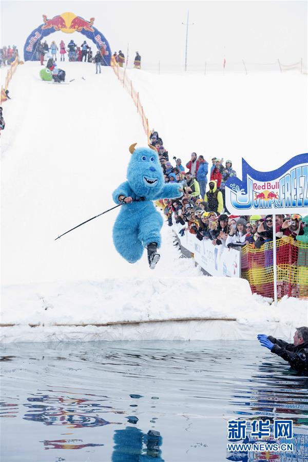 3月20日,一名选手身着卡通服饰参加古达乌利“冰池跳水节”活动。